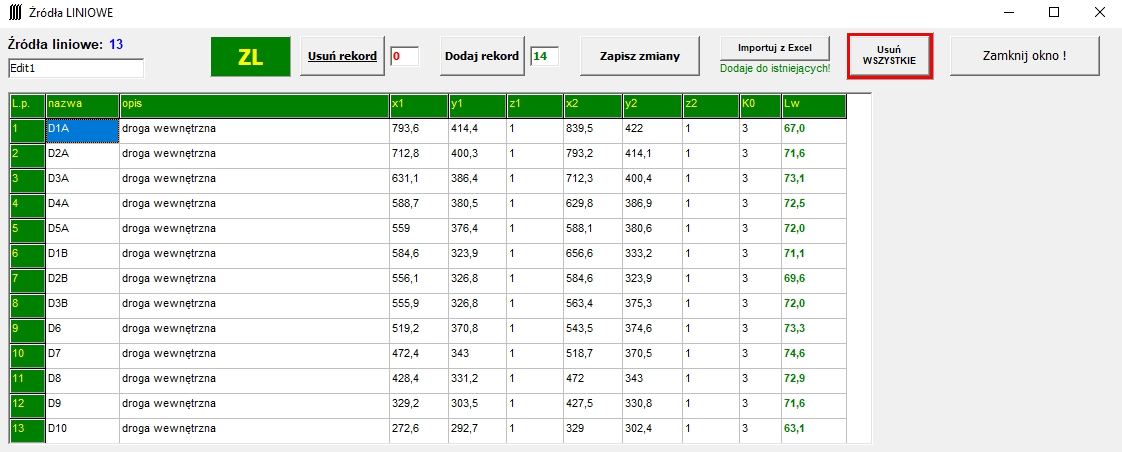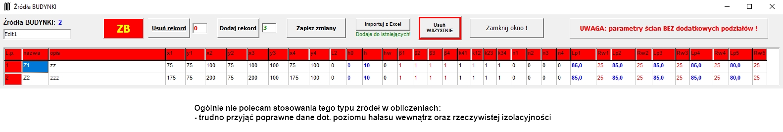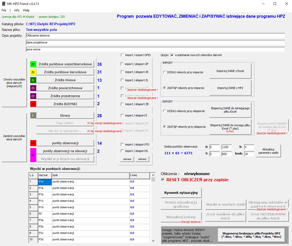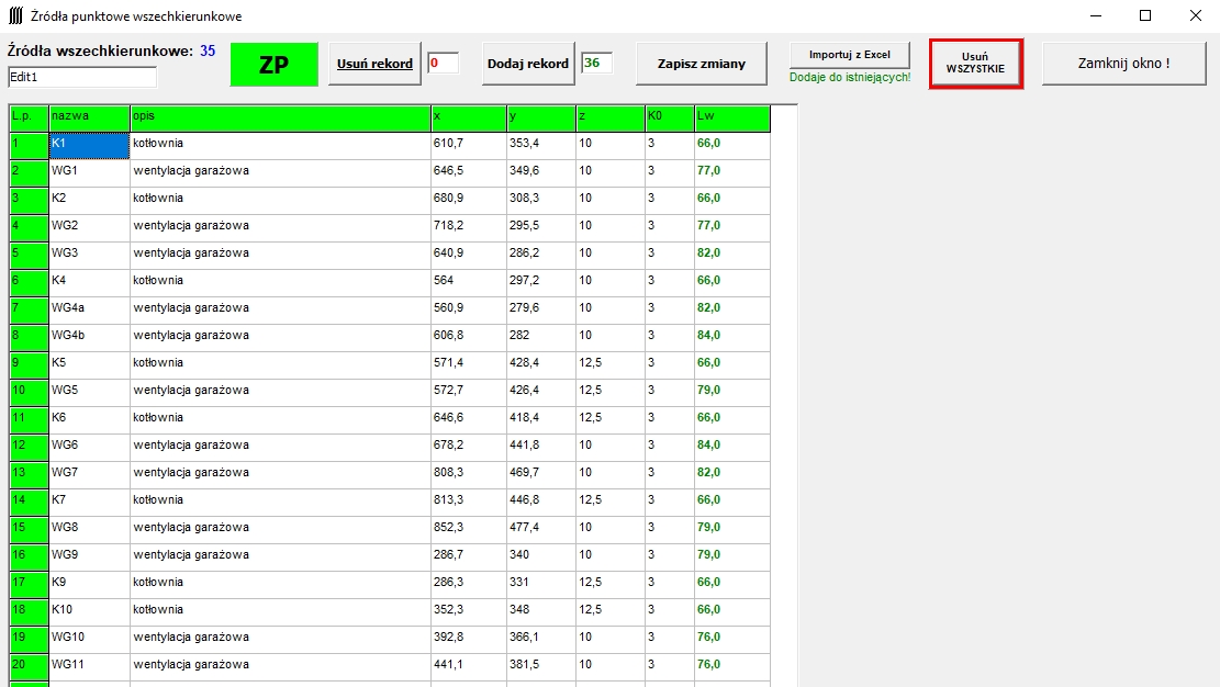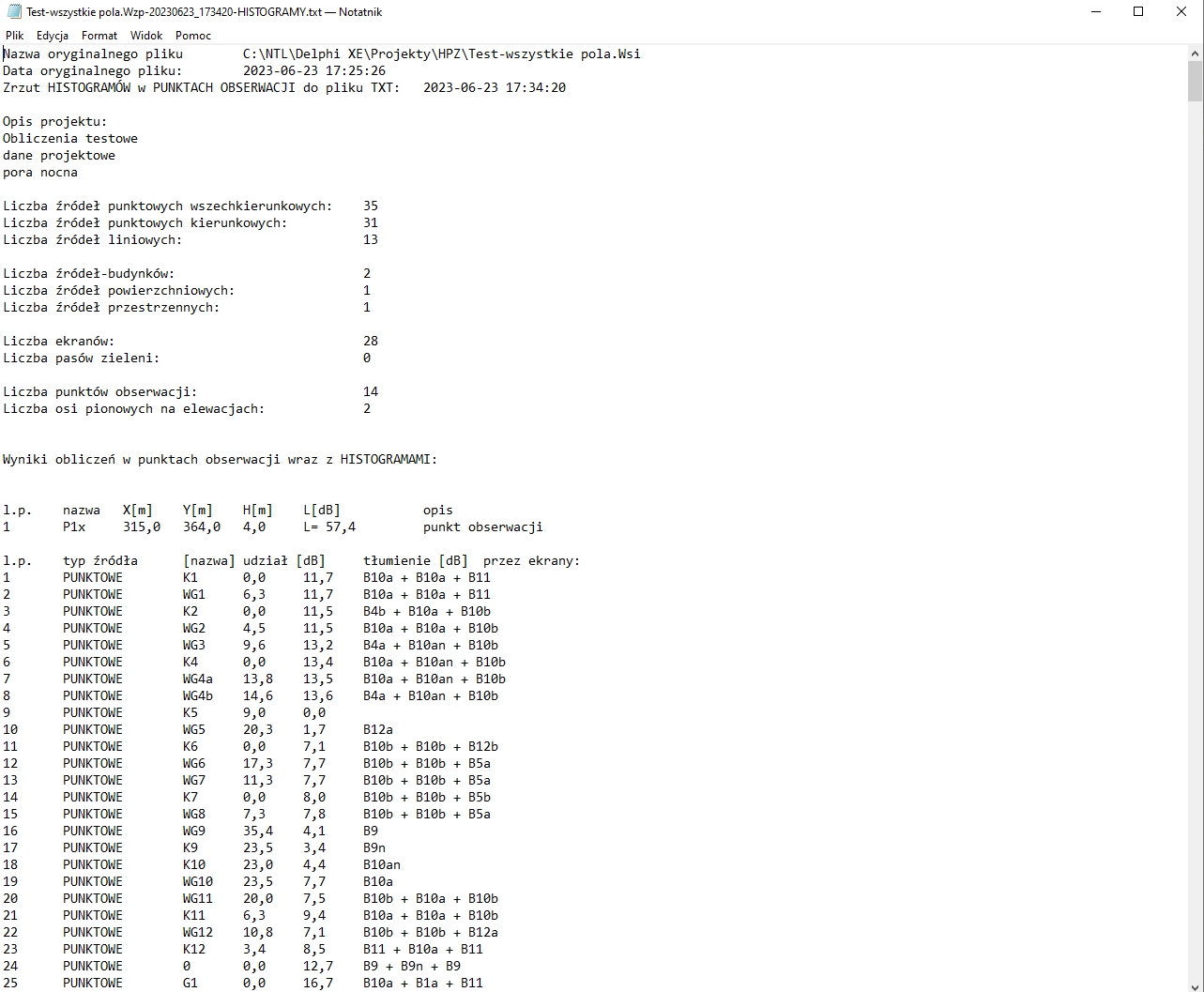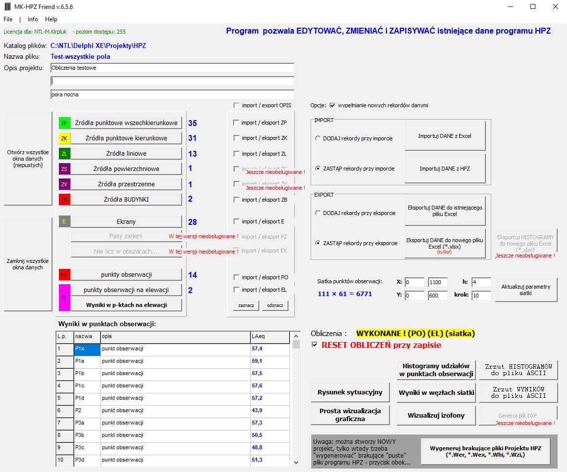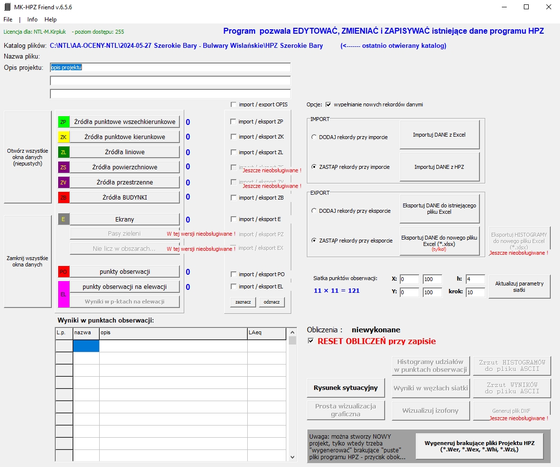 - obecnie obsługuje: źródła punktowe, źródła kierunkowe, źródła liniowe, źródła-budynki, ekrany, punkty obserwacji, punkty obserwacji na elewacji, parametry siatki obliczeniowej.